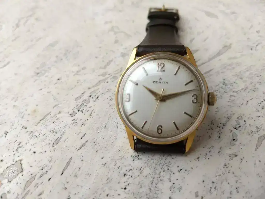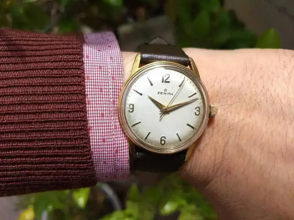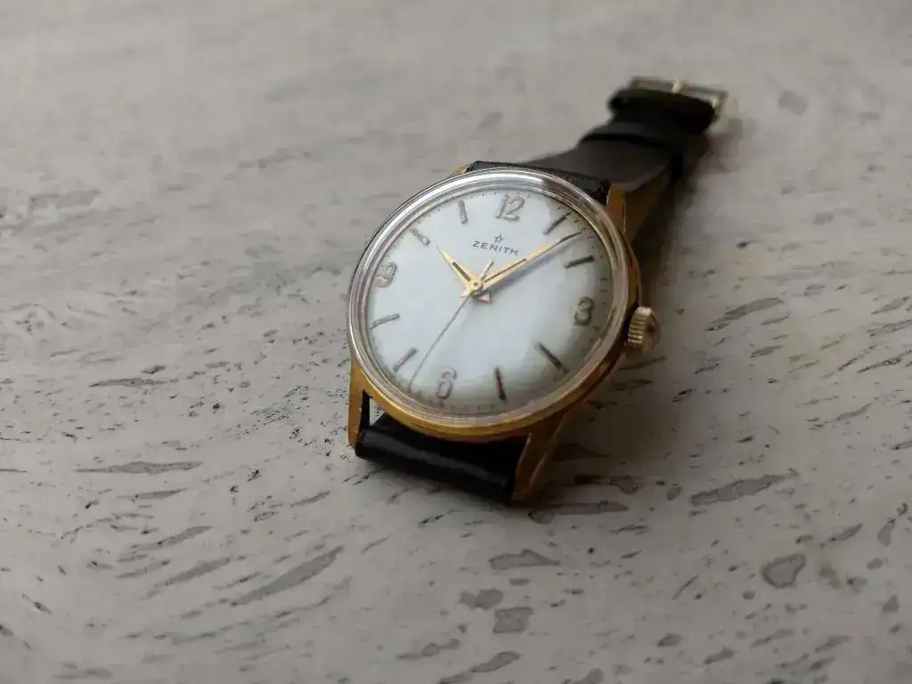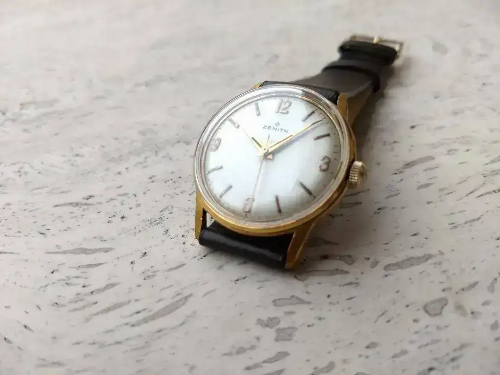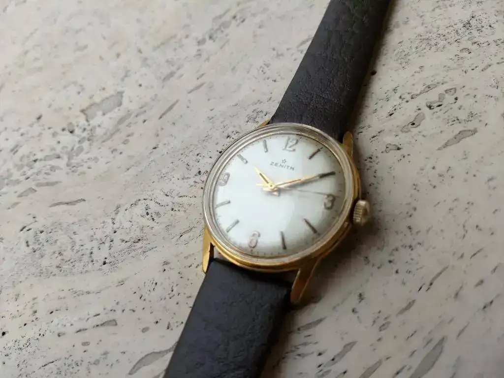 Saco este bonito ZENITH vintage de finales de los 50 en excelente estado estético y funcionando perfectamente. Procede de la fábrica de Bezançon, especializada en calibres 106 y 120 durante los años 40s y 50s y en la serie 25xx durante los años 60s. Este ejemplar monta un 106-50-6 en estado de revista. Se trata de la variante con segundero central, comparativamente más escasa.