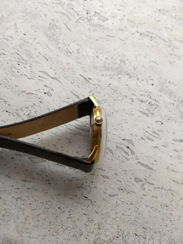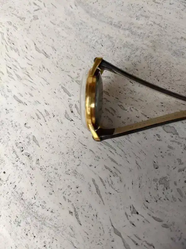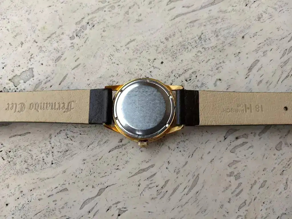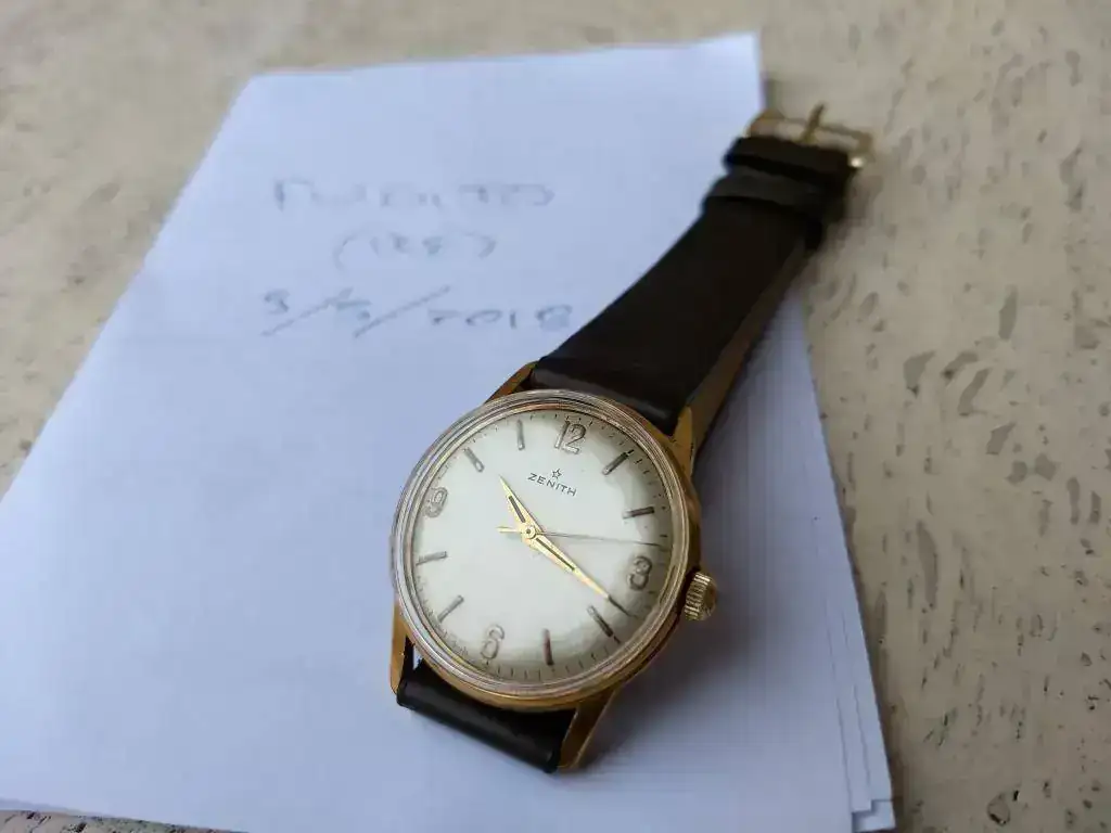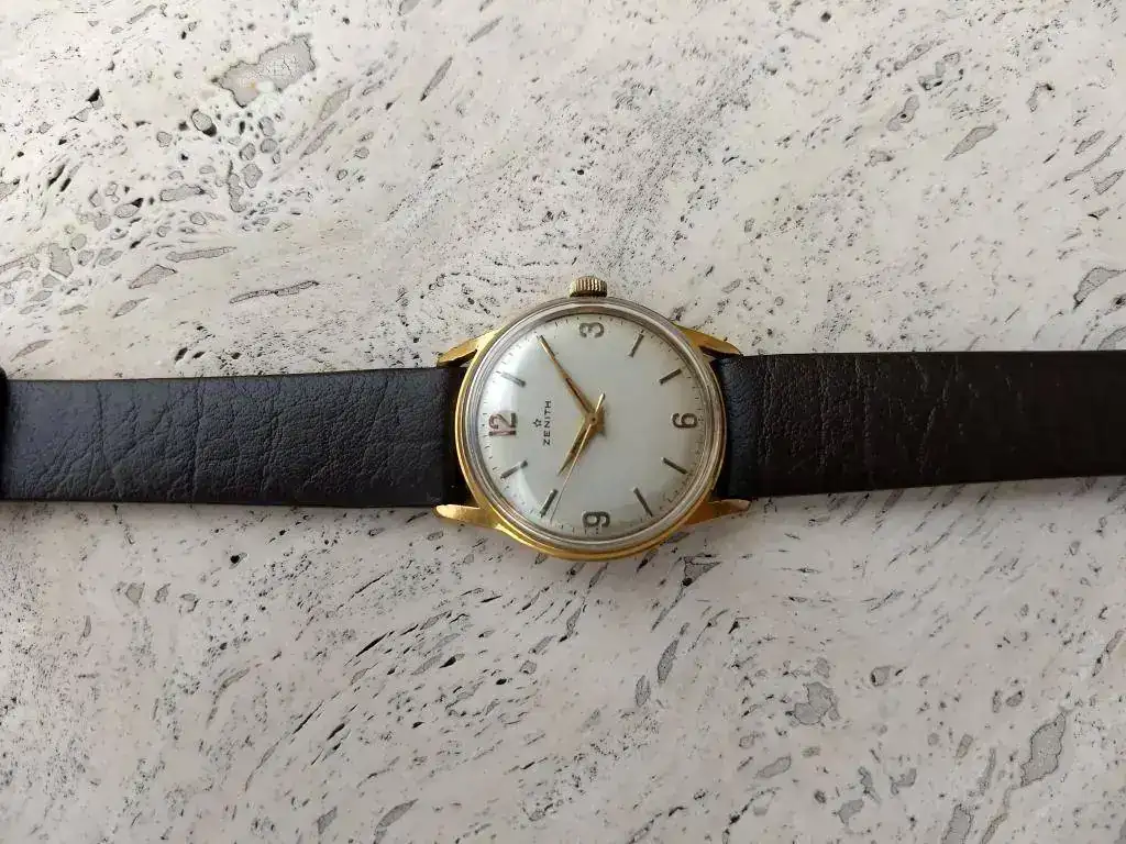 Todo de origen excepto plexy nuevo. Caja dorada muy íntegra sin desgaste, desconchones ni nada que salte a la vista, al márgen de las lógicas microseñales en un reloj de casi 60 años. Igualmente la esfera color marfil íntegra sin defecto alguno. Tapa rocada de acero con escudo Zenith aunque bastante atenuado por el tiempo.