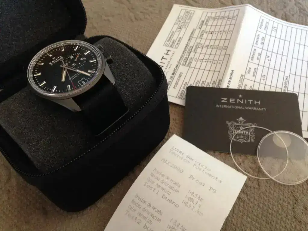 Estoy muy contento con el trato recibido por parte del personal de LVMH, son gente muy amable, me han escuchado (1 hora estuvimos hablando y eso que llegue 10 minutos antes de cerrar), hemos discutido y al final ha quedado todo mas o menos claro aunque no estoy contento con el final. Me han cambiado el zafiro por cortesia y me han regalado una caja para usarla de viaje bastante chula y a lo que vamos, al final han reconocido por decirlo de alguna manera, que la calidad del pvd es muy fragil.. que son marcas por el desgaste diario (Incluyendo pequeños roces etc..), al final si hay repuestos de caja, pero no hay reparacion del recubrimiento sin cambio de caja.. Si hay recambios y son de la misma calidad no vamos a ningun sitio, con lo cual la mejor solucion que le veo es recubrir por mi cuenta otra vez la caja con un recubrimiento un poco mas grueso que el que trae, pulir la caja cuando ya este "fea" o venderlo asumiendo que en su dia la cague y no fue una buena compra y perder una pasta.. (Tenia en una mano un Explorer II de 42mm negro de 2ª mano y este en la otra nuevo por el mismo precio y me decidi por el Zenith) asi que no se que hare con este niño, de momento seguire con el cuidandole entre paños de seda mientras busco otro negro que me enamore..