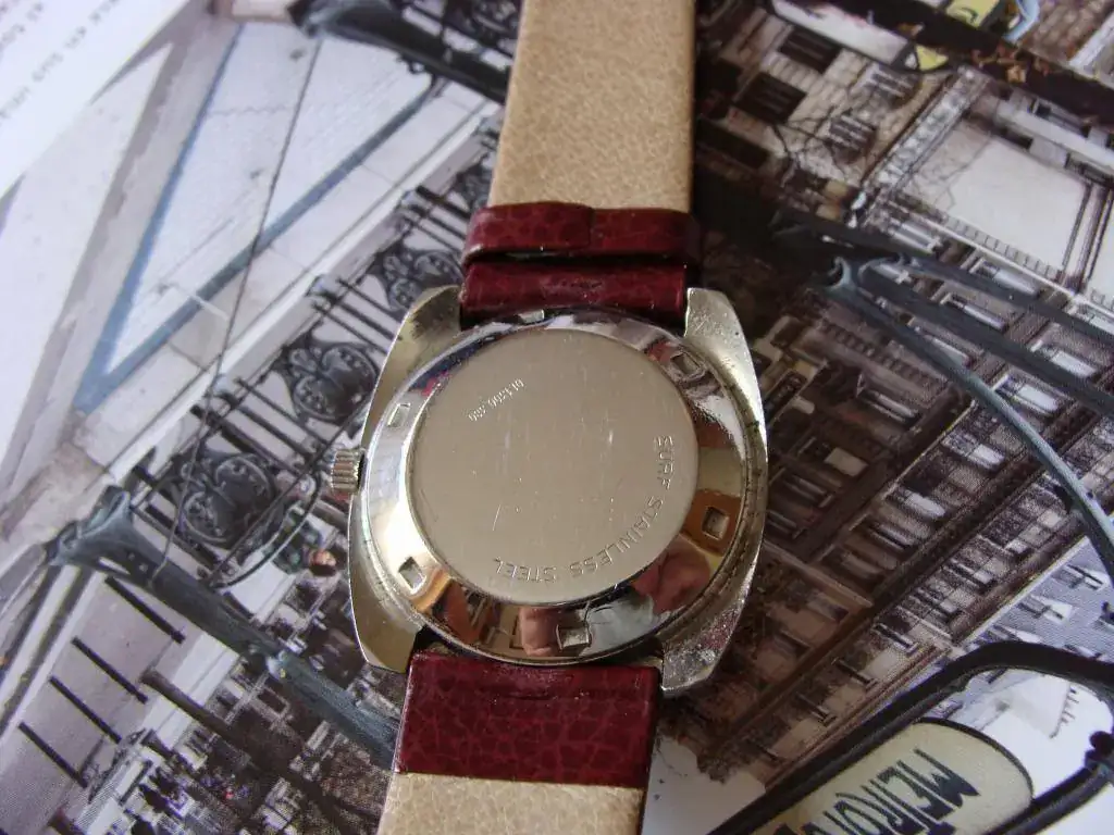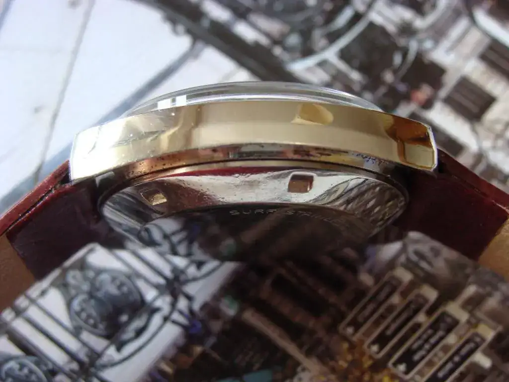 Hola. Saco a la venta este precioso Zenith vintage. Perteneceal grupo de los que, en los 70´s, se llamaron “Surf”, por una inscripción que aparece en sus traseras. En realidad, ese “surf” es la abreviatura de “surface”, y aparecía junto al clásico “Stainless Steel”. Algo que ahora es obvio, pero que allá por mediados de los setenta era motivo de orgullo para el fabricante.