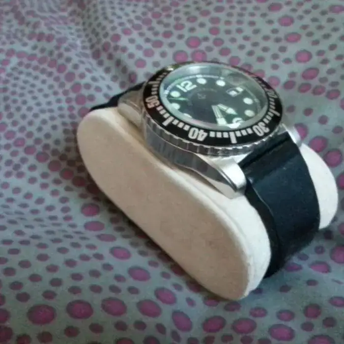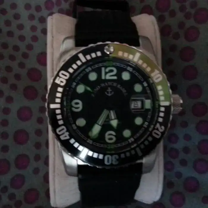 - Caja en acero inoxidable pulido, diámetro de la caja 45mm sin corona, caja de altura 17,5 mm, con bisel en acero negro/verde incrustación, 60 Escala de minutos y punto luminoso, giratorio unidireccional