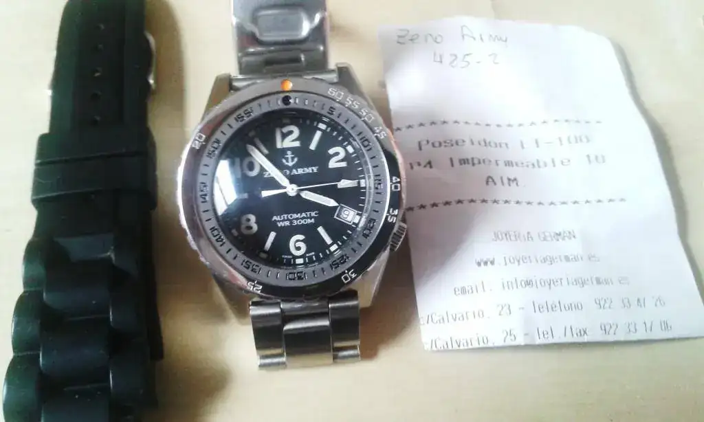 Te lo mando sin caja ni papeles, pero además la garantía estaría caducada…este reloj me lo compré en ebay hace ya unos cuatro años, y yo he sido su dueño original. El armis es no original pero muy bien adaptado y un caucho, excelente para el veranito.