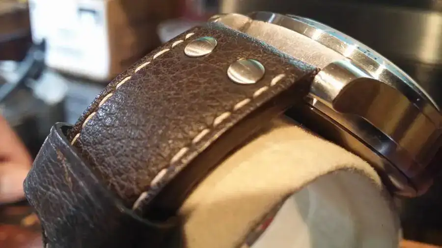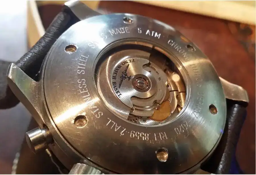 Descripción : caja de acero, esfera negra con números árabes, bisel numerado, agujas de acero en blanco, cronógrafo, tres indicadores en el dial, segundos, minutos y horas, corona atornillada y dos pulsadores, diámetro 47 mm, sumergible 30 metros, tapa trasera transparente, correa de piel marrón, cierre hebilla de acero.