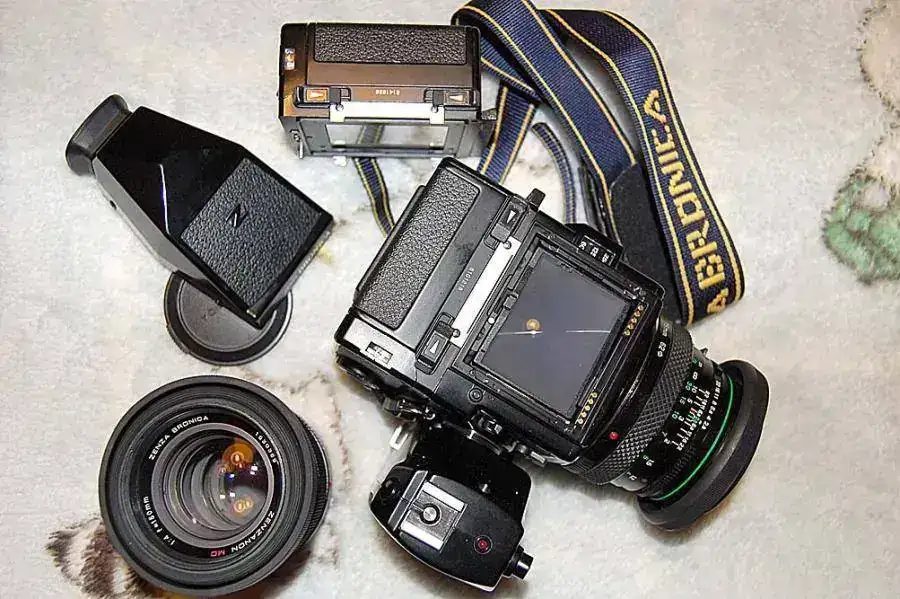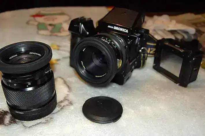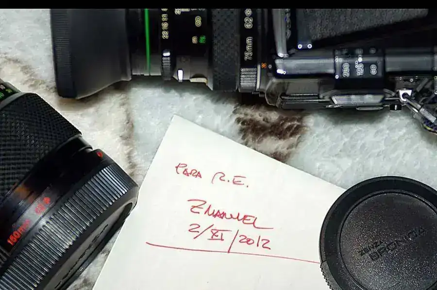 Viene con dos objetivos con sus correspondientes tapas delantera y trasera y parasoles originales. Son el Zenzanon 75 mm. y el 150 mm.