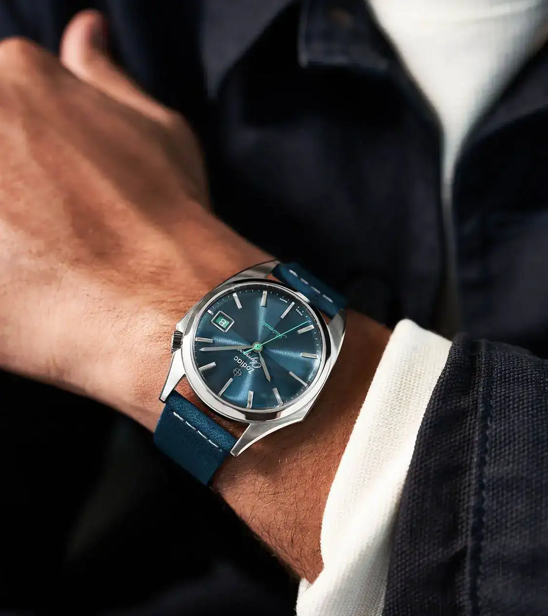 Aquí está el ZO 9171 con esfera azul, 37mm y bonita aguja turquesa a juego con el datario.
