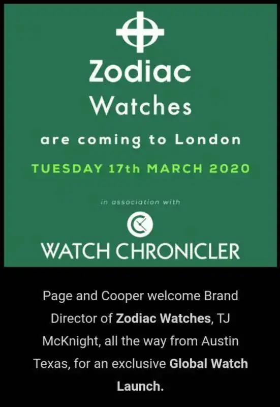 Parece que Zodiac, en un evento con el distribuidor británico Page&Cooper, hará una presentación exclusiva de un lanzamiento el próximo 17.03.2020 en Londres.