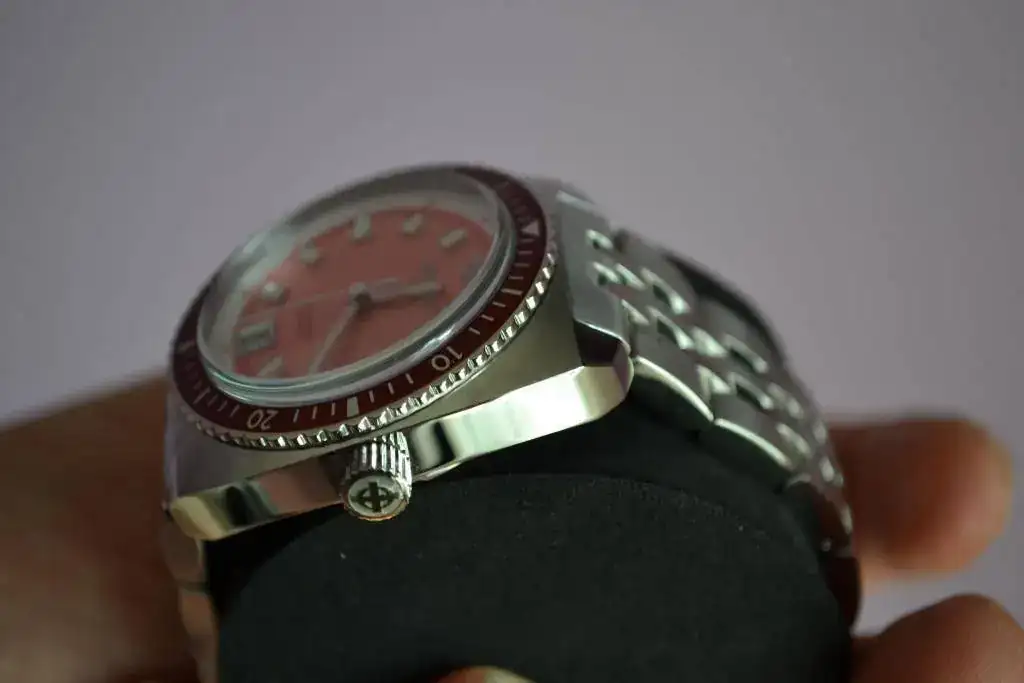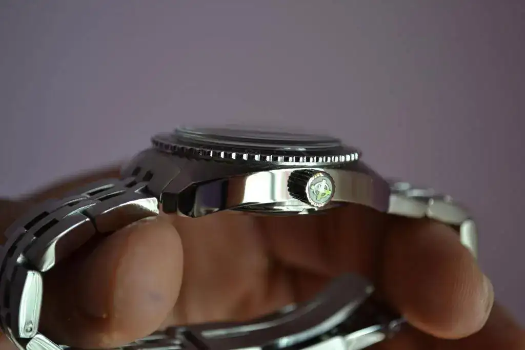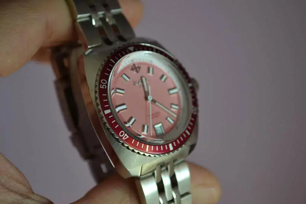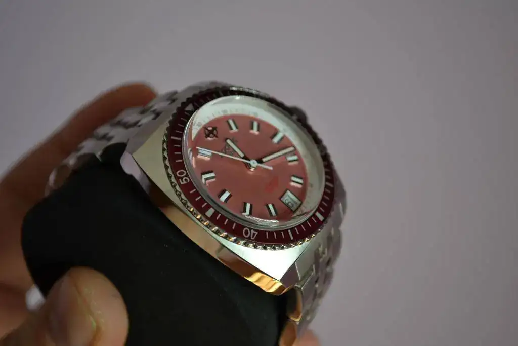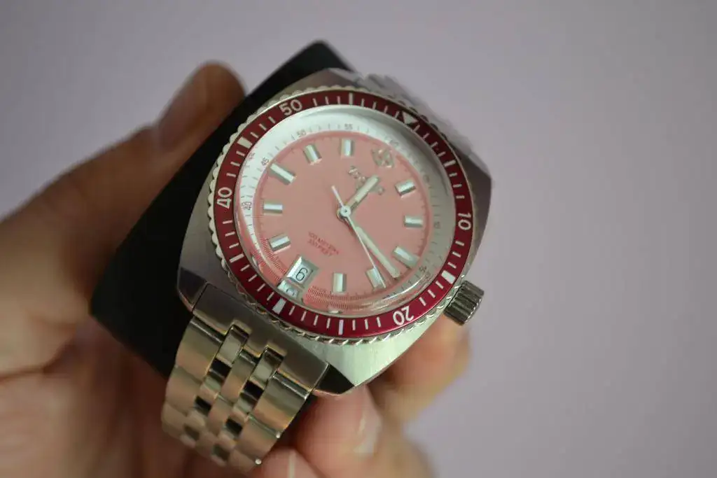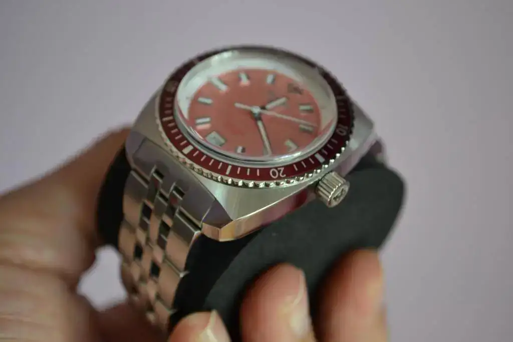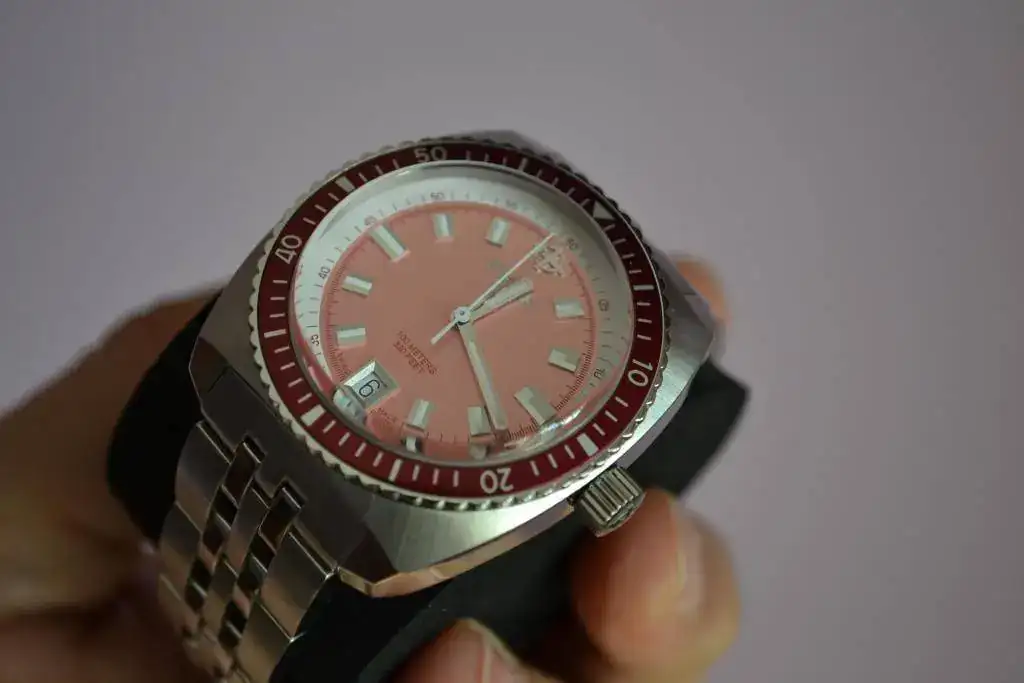 Suizo de preciosa estética diver setentera, tamaño generoso, cristal super dommed, bisel unidireccional, calibre de cuarzo suizo con pila cambiada la semana pasada, armis completo con eslabones como para ponérselo en el tobillo...